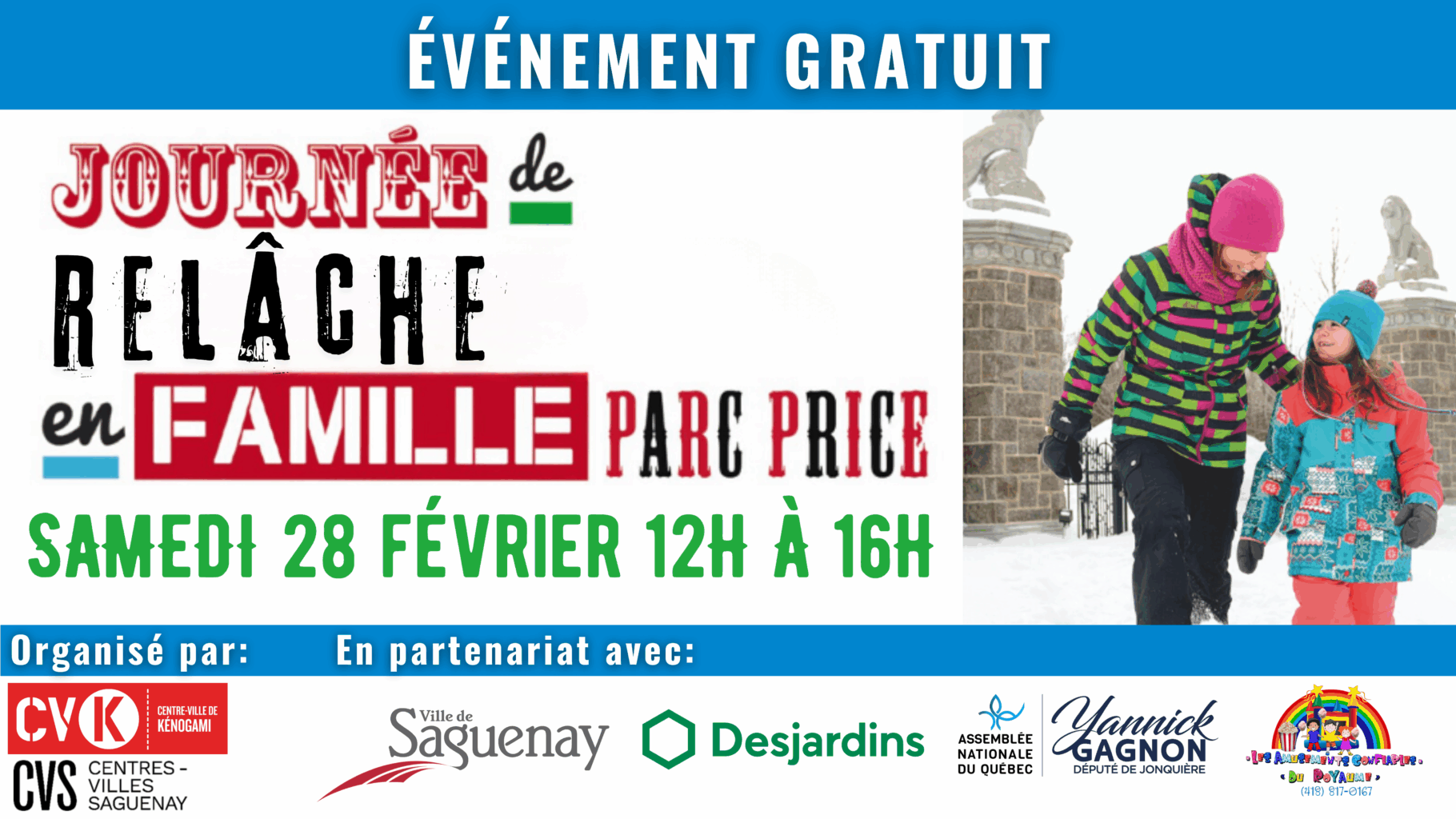 Cet événement entièrement gratuit promet un après-midi d’animation (Fous du Roi, musique, mascotte Sentinelle, jeu gonflable), accompagnée d’un service de collations et de boissons chaudes.